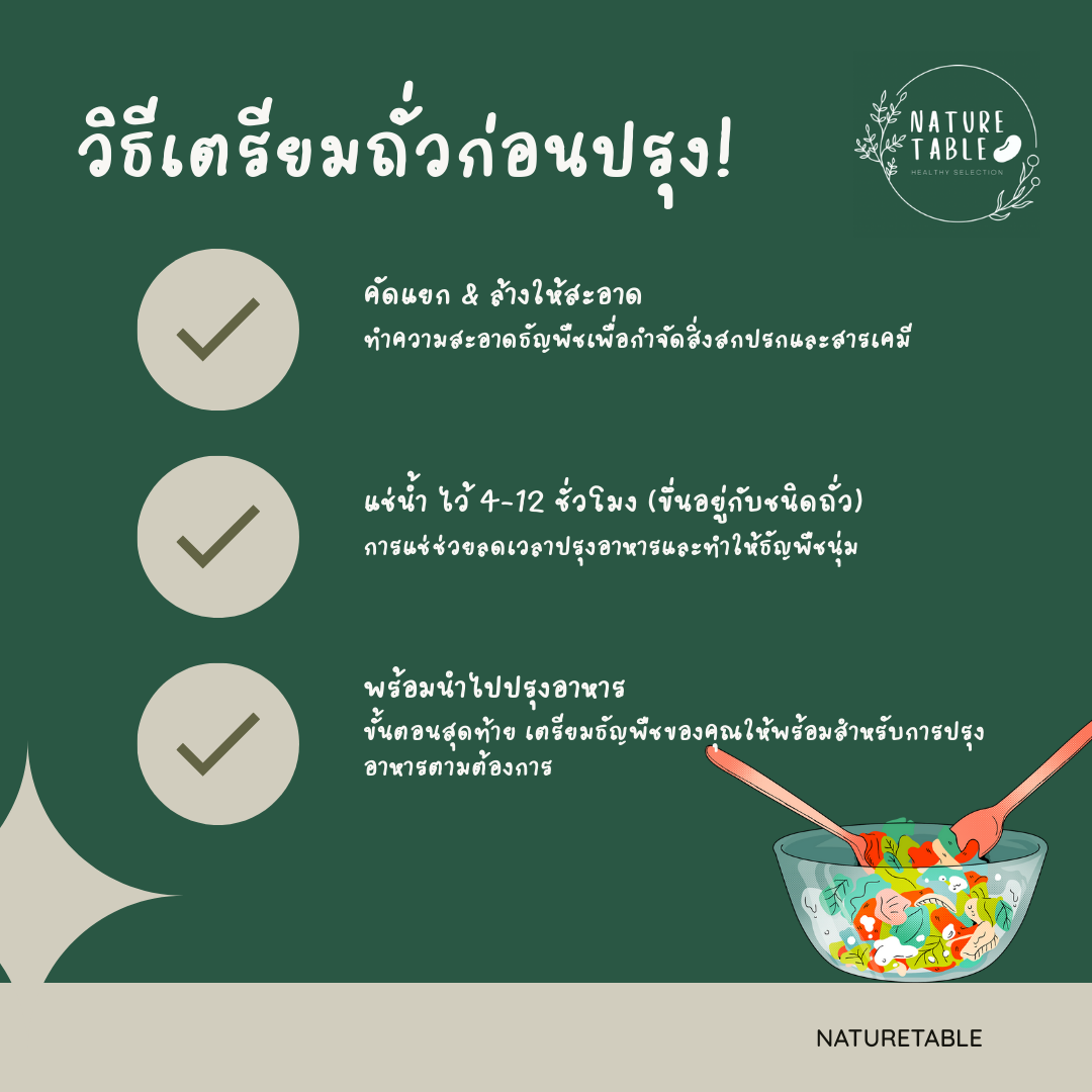 1.ก่อนแช่ ต้องคัดแยก ล้างน้ำ ตรวจสอบ ถั่วแก่ดีจะจมน้ำ ถั่วลูกลอยควรคัดทิ้ง